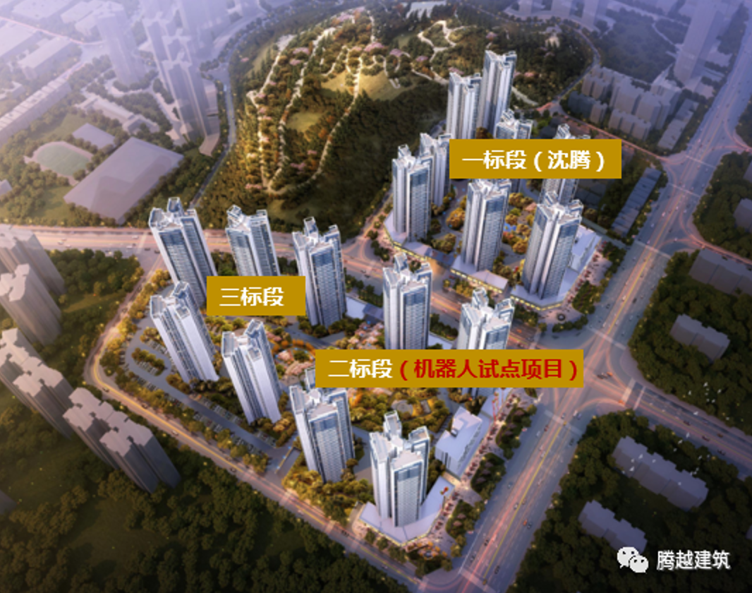 騰越建筑粵東公司惠州大陂項目位于惠州市仲愷高新區(qū)大陂村,由4棟33~34層住宅(低于百米)和1棟7層公寓及3層地下室組成,最高建筑高度98.60m,總建筑面積12.08萬㎡(其中包含地下室3萬㎡),為騰越建筑首批機器人應用試點項目。