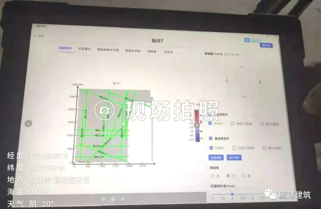 此外,在集團(tuán)及公司的大力號(hào)召與積極推廣下,四川眉山項(xiàng)目還在可支混凝土結(jié)構(gòu)階段、抹灰階段、土建精裝移交等環(huán)節(jié),所使用的建筑機(jī)器人采用先進(jìn)的AI測(cè)量算法處理技術(shù),進(jìn)行墻面平整度、垂直度、方正性、陰陽角、天花水平度、地面水平度等多個(gè)測(cè)量項(xiàng)測(cè)量,全面提高效率的同時(shí),大大提升項(xiàng)目實(shí)測(cè)實(shí)量準(zhǔn)確性。