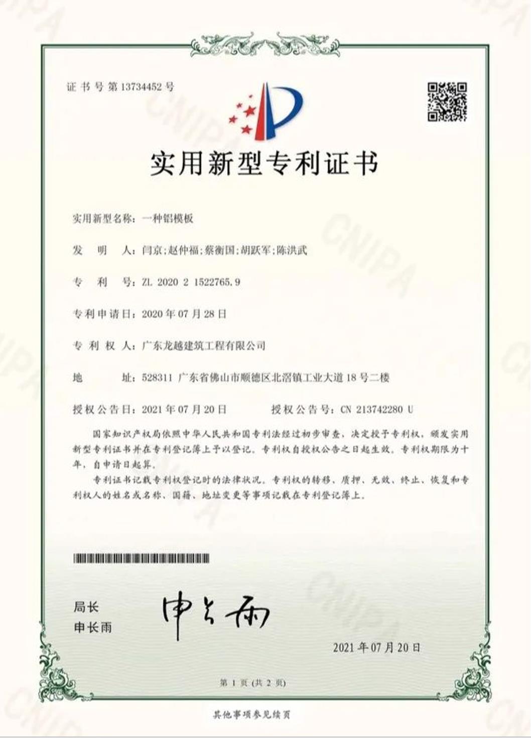 佛肇公司容桂晴瀾苑二期項(xiàng)目在工程施工管理過程中,結(jié)合以前的鋁模板應(yīng)用經(jīng)驗(yàn),與鋁模板生產(chǎn)分供方溝通交流,對工程采用的鋁模板進(jìn)行了很多細(xì)節(jié)的深化設(shè)計,其中一項(xiàng)“鋁模壓槽板毛化”技術(shù)申請獲得了由國家知識產(chǎn)權(quán)局頒發(fā)的實(shí)用新型專利證書,并授予了專利權(quán)。