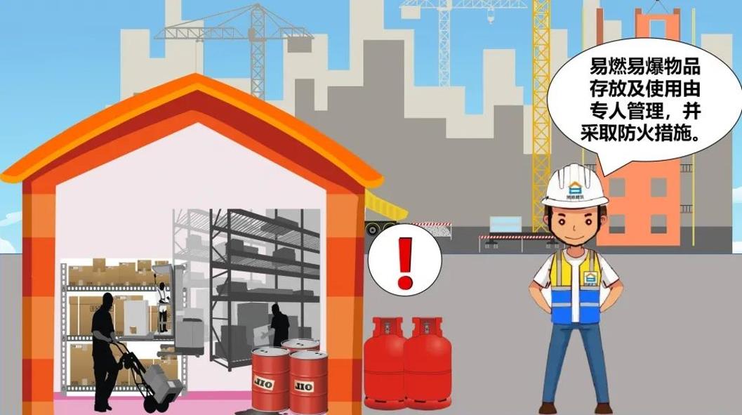 現(xiàn)場(chǎng)材料需分類存放于倉(cāng)庫(kù),配備滅火器,易燃易爆物品需由專人保管,不得隨意堆放,如遇意外情況容易造成火災(zāi)發(fā)生。