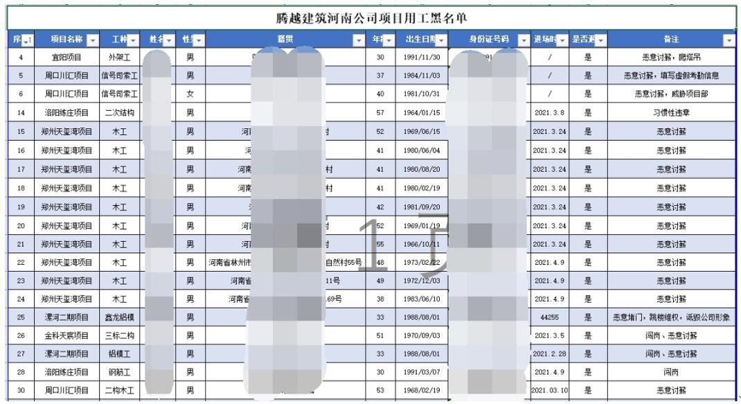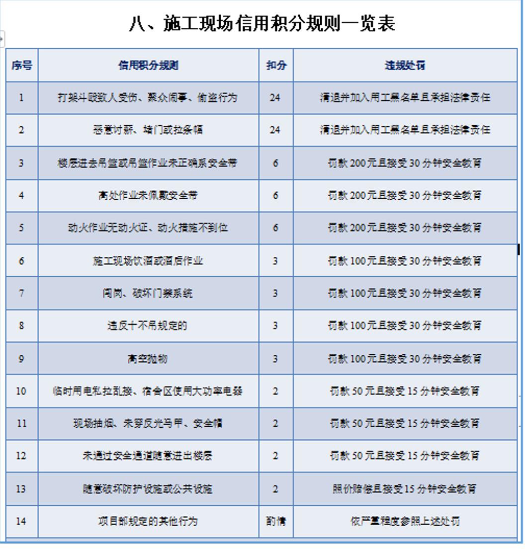 項(xiàng)目嚴(yán)格執(zhí)行公司安全管理?xiàng)l例及河南公司安全管控考核管理制度,同時(shí)建立云端數(shù)據(jù)庫(kù)2021年河南公司信用體系,類(lèi)比道路交通管理,將習(xí)慣性違章、聚眾斗毆、惡意討薪等工人拉入黑名單,再將用工信息及黑名單作業(yè)人員信息共享,嚴(yán)禁黑名單作業(yè)工人進(jìn)入河南公司在建項(xiàng)目,確保用工安全。