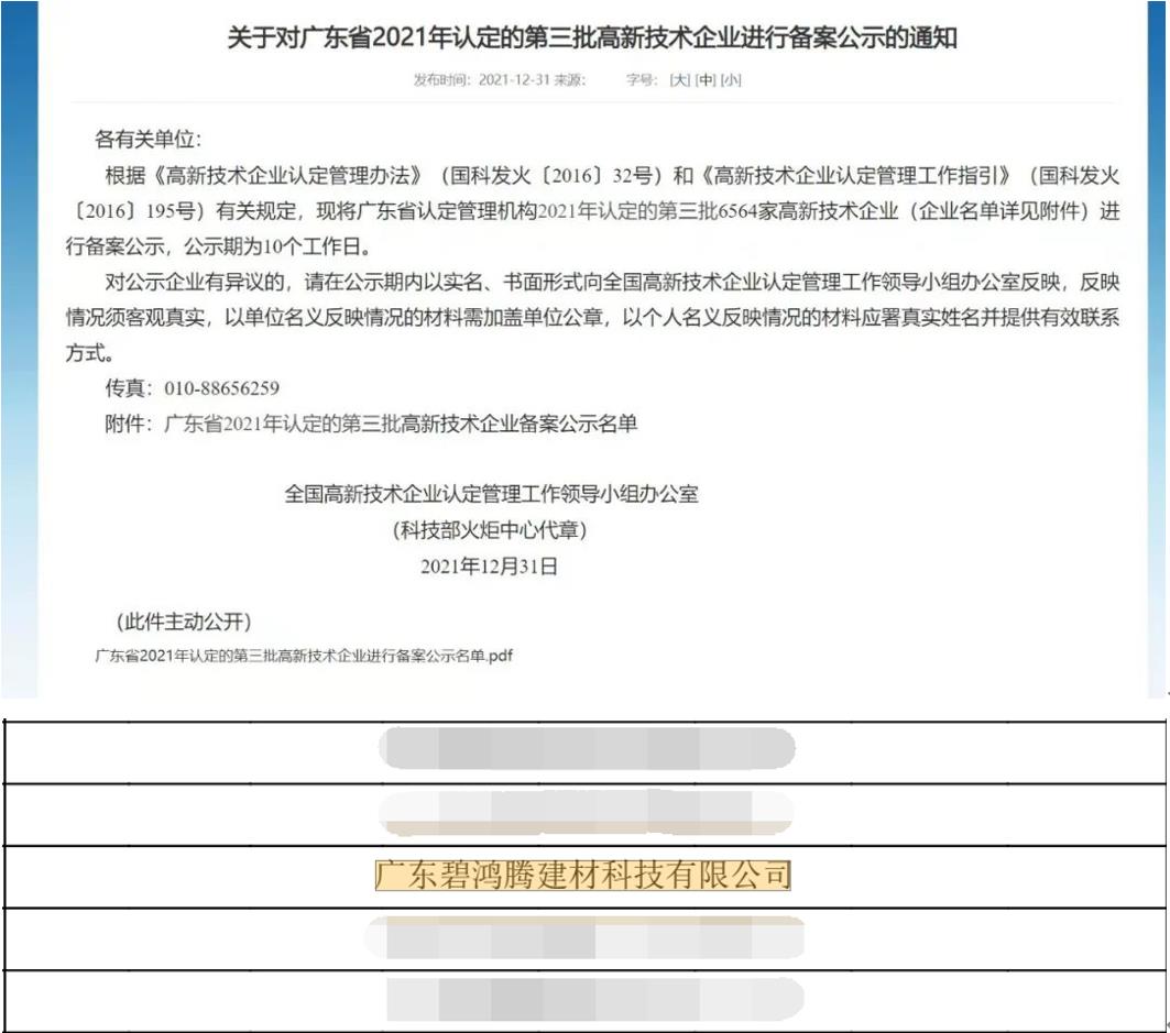 近日,廣東省2021年認(rèn)證的第三批高新技術(shù)企業(yè)備案公示名單新鮮出爐,廣東碧鴻騰建材科技有限公司榜上有名,至此,騰越建筑裝配式建筑事業(yè)部下轄廣東碧鴻騰、安徽鴻騰均已完成高新技術(shù)企業(yè)認(rèn)定。