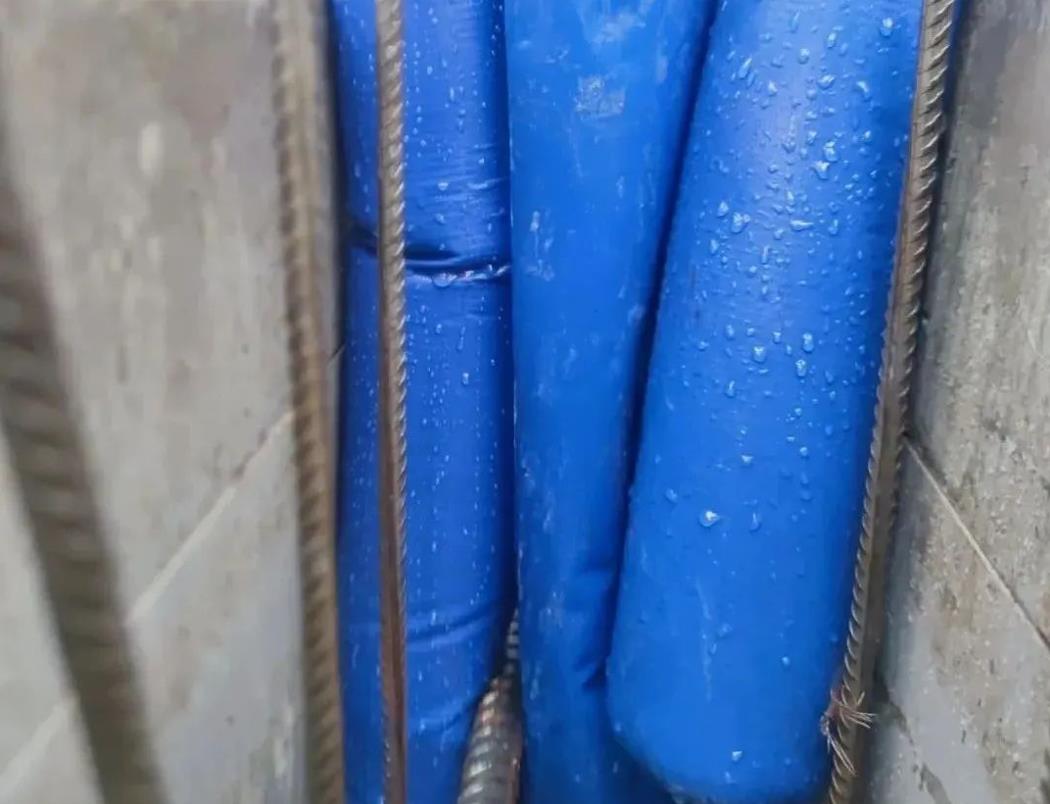 其中高低標(biāo)號混凝土攔截氣囊施工技術(shù)是一種可以充氣放氣的圓柱型柔性氣模,充氣后起到分隔高低標(biāo)號混凝土的作用,代替此部位原來使用的鋼絲網(wǎng),減少應(yīng)力,避免接茬部位后期產(chǎn)生裂縫(施工縫),周轉(zhuǎn)使用次數(shù)高,可周轉(zhuǎn)40~50 次,適用于結(jié)構(gòu)梁與剪力墻、柱處不同等級砼之間的攔截措施。