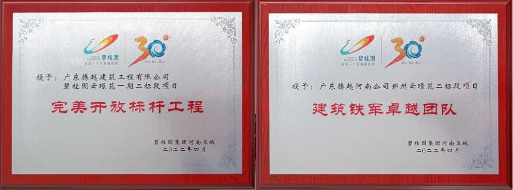 2022年4月初,經(jīng)過(guò)集團(tuán)各部聯(lián)合驗(yàn)收,終獲河南區(qū)域展示區(qū)高分成績(jī)95.5分,并被碧桂園集團(tuán)河南區(qū)域授予“完美開(kāi)放標(biāo)桿工程”稱號(hào)。同時(shí),項(xiàng)目團(tuán)隊(duì)也得到河南區(qū)域和建設(shè)單位的高度認(rèn)可,授予項(xiàng)目“建筑鐵軍卓越團(tuán)隊(duì)”榮譽(yù)稱號(hào)。