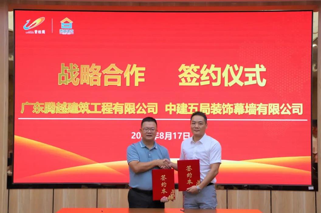 2022年8月17日,中建五局裝飾幕墻有限公司與騰越建筑隆重舉行座談交流會暨合作簽約儀式。中建五局裝飾幕墻有限公司董事長李滔、副總經(jīng)理彭洪波、華南總經(jīng)理胡進、副總經(jīng)理朱文明等領(lǐng)導(dǎo),騰越建筑總經(jīng)理馬小軍、執(zhí)行總經(jīng)理鄧培初、副總經(jīng)理兼總經(jīng)濟師田志敏、總經(jīng)理助理卿上偉、資深營銷總監(jiān)兼部門總經(jīng)理曹小華、裝飾公司總經(jīng)理馬芯及市場拓展相關(guān)人員出席儀式。