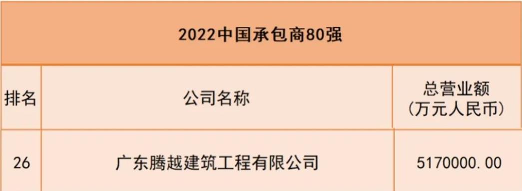 “2022中國(guó)承包商80強(qiáng)”榜單(點(diǎn)擊圖片查看原文)騰越建筑以第26位的排名,再度入圍“中國(guó)承包商80強(qiáng)”評(píng)選榜單,排位較2021年持續(xù)上升3位。在2020年-2022年低迷的市場(chǎng)環(huán)境中,騰越建筑優(yōu)化市場(chǎng)布局,整合優(yōu)勢(shì)資源,構(gòu)建高質(zhì)量發(fā)展格局,以健康穩(wěn)健的良好態(tài)勢(shì)逆勢(shì)而上,榮登“中國(guó)承包商80強(qiáng)”榜單,公司品牌影響力再創(chuàng)新高!