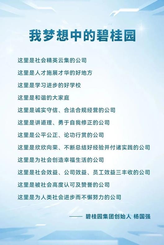 談及企業(yè)愿景,楊惠妍再次分享了集團(tuán)創(chuàng)始人楊國(guó)強(qiáng)親手書寫的《我夢(mèng)想中的碧桂園》。“我一直覺得,這十二句話最能詮釋我理想中的碧桂園:前四句闡述了企業(yè)的定位,體現(xiàn)了企業(yè)和同事們之間的關(guān)系,其中飽含了愛與認(rèn)同;中間四句清晰地描述了企業(yè)的經(jīng)營(yíng)之道;最后四句是企業(yè)的初心和社會(huì)責(zé)任。”她說,這就是我心中的碧桂園,也是我將努力去踐行實(shí)現(xiàn)的碧桂園。