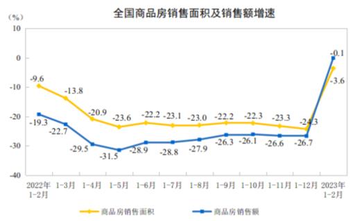 2023年,經(jīng)濟(jì)復(fù)蘇態(tài)勢(shì)已現(xiàn)。國(guó)家統(tǒng)計(jì)局?jǐn)?shù)據(jù)顯示,1-2月份,伴隨著疫情防控較快平穩(wěn)轉(zhuǎn)段,經(jīng)濟(jì)循環(huán)加快暢通,生產(chǎn)需求明顯改善,經(jīng)濟(jì)運(yùn)行企穩(wěn)回升,全國(guó)商品房銷售面積及銷售額增速降幅較去年大幅收窄。