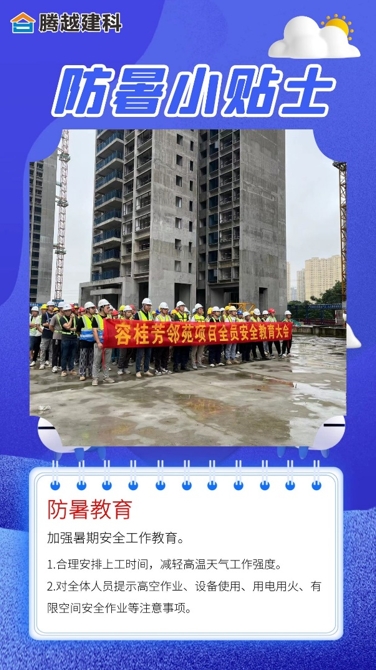入夏以來(lái),騰越建科集團(tuán)積極落實(shí)各項(xiàng)防暑降溫措施,切實(shí)保障廣大勞動(dòng)者的身體健康和勞動(dòng)安全,陸續(xù)開(kāi)展安全教育、送清涼、慰問(wèn)等一系列活動(dòng),覆蓋24個(gè)區(qū)域公司,約40000名工友。